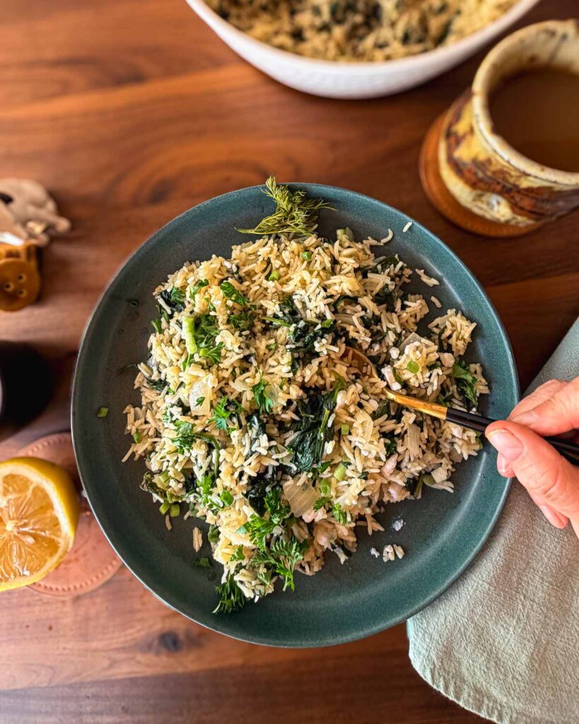 Spanakorizo (pronounced spah-nah-KOH-ree-zoh) is a simple rice dish made with spinach, rice, dill, and lots of lemon! This is very similar to spanakopita, but without the pastry or feta. Like most traditional recipes, this is not a hard and fast rule, and you can add feta! (I added the Follow Your Heart vegan feta. It tastes the same!)