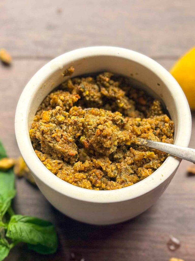 Pistachio basil pesto is originally from Sicily. Thanks to the climate, pistachios are easily grown there. Pistachio is the main ingredient, along with basil, garlic, a touch of lemon, and olive oil. The ingredients are combined to make a sauce that can be tossed with pasta, served with bruschetta, or used as a condiment in a sandwich.