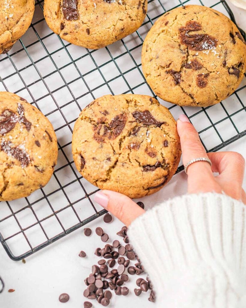 - Finish and Cool: When you pull the cookies out of the oven, immediately sprinkle with flaky sea salt. Transfer to a rack to cool slightly before eating.